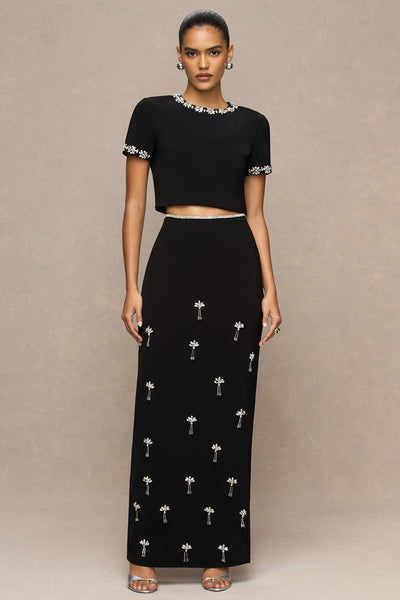 Elevate your occasion wear with Salma. Crafted in our premium black crepe, this cropped top offers a sleek and flattering fit. The neckline and short sleeves are adorned with delicate embellishments, adding a touch of glamour. Style it effortlessly with our Aven skirt for a show-stopping, coordinated look.